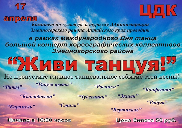 17 апреля в ГДК в рамках международного дня танца состоится большой концерт хореографических коллективов Змеиногорского района. Не пропустите главное танцевальное событие этой весны. Начало в 16 часов.