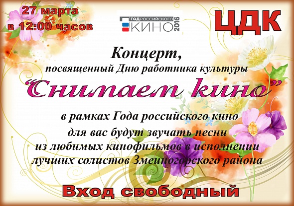 27 Марта 2016 г. в 12.00 приглашаем в ЦДК г.Змеиногорска на праздничный концерт, посвященный Дню работника культуры.