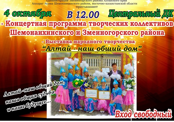 В Городском доме культуры прошла концертная программа творческих коллективов Шемонаихинского и Змеиногорского районов. Так же была представлена выставка народного творчества.