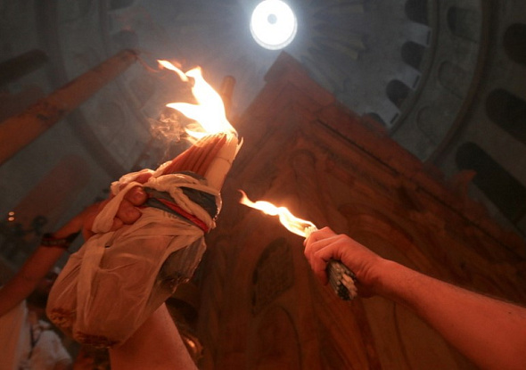 Свидетели схождения Благодатного огня утверждают, что в первые минуты после появления его пламя не обжигает
