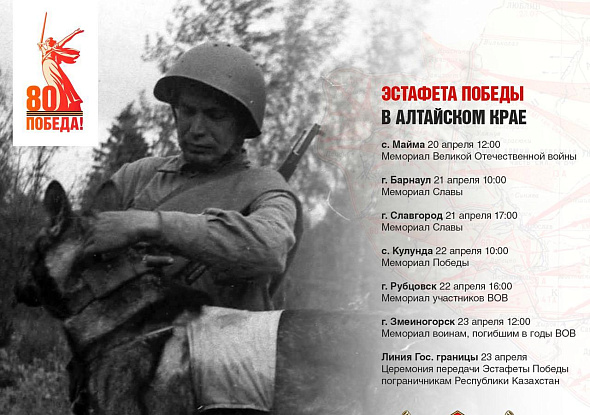 Дорогие друзья! Приглашаем вас на торжественный митинг в честь прибытия кубка «Эстафеты Победы» в г. Змеиногорск с участием пограничников, первых лиц муниципального округа Змеиногорский район, руководителей силовых структур, молодежных патриотических объединений, который состоится 23 апреля в 12.00 на Мемориальном комплексе воинам, погибшим в годы Великой Отечественной войны 1941-1945 гг.