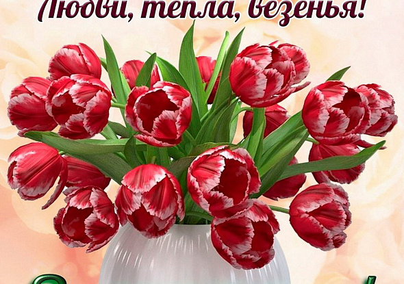 Дорогие женщины! Поздравляем с Международным женским днем! Желаем: сердцу вместить всю красоту; птицам счастья летать над головою, солнцу ласково и нежно согревать; погоде в доме быть на уровне комфорта; любить; любимой быть; мечтать; благоухать; стремиться к целям; счастьем женским наслаждаться; купаться в роскоши; цветами упиваться.