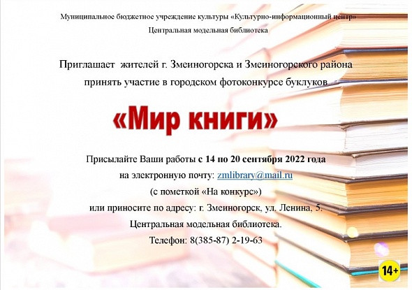 Центральная модельная библиотека приглашает к участию в фотоконкурсе буклуков "Мир книги" жителей города Змеиногорска и Змеиногорского района в возрасте 14 лет и старше.