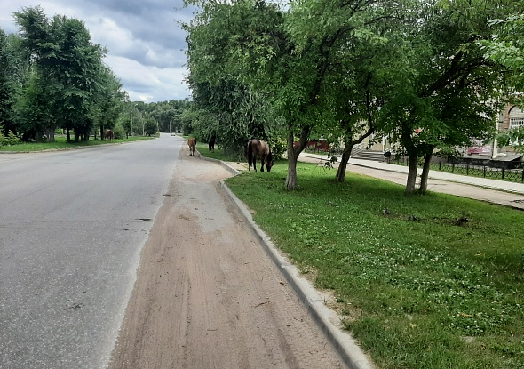Небольшой табун лошадей сегодня гуляет на центральной улице Змеиногорска.