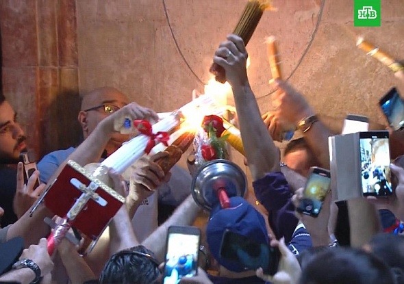 В Великую Субботу, 1 мая 2021 года, в Кувуклии храма Воскресения Христова (Гроба Господня) в Иерусалиме сошел Благодатный огонь.