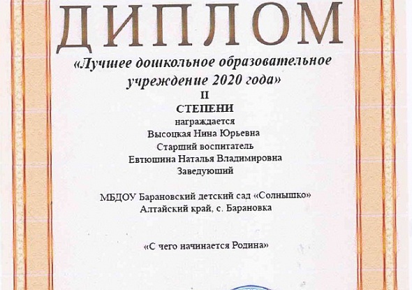 Подведены итоги Всероссийского Ломоносовского конкурса-смотра по теме «С чего начинается Родина» в номинации «Лучшее дошкольное образовательное учреждение 2020 года ». В результате МБДОУ Барановский детский сад "Солнышко", вошел в рейтинг50 лучших организаций дошкольного образования.
