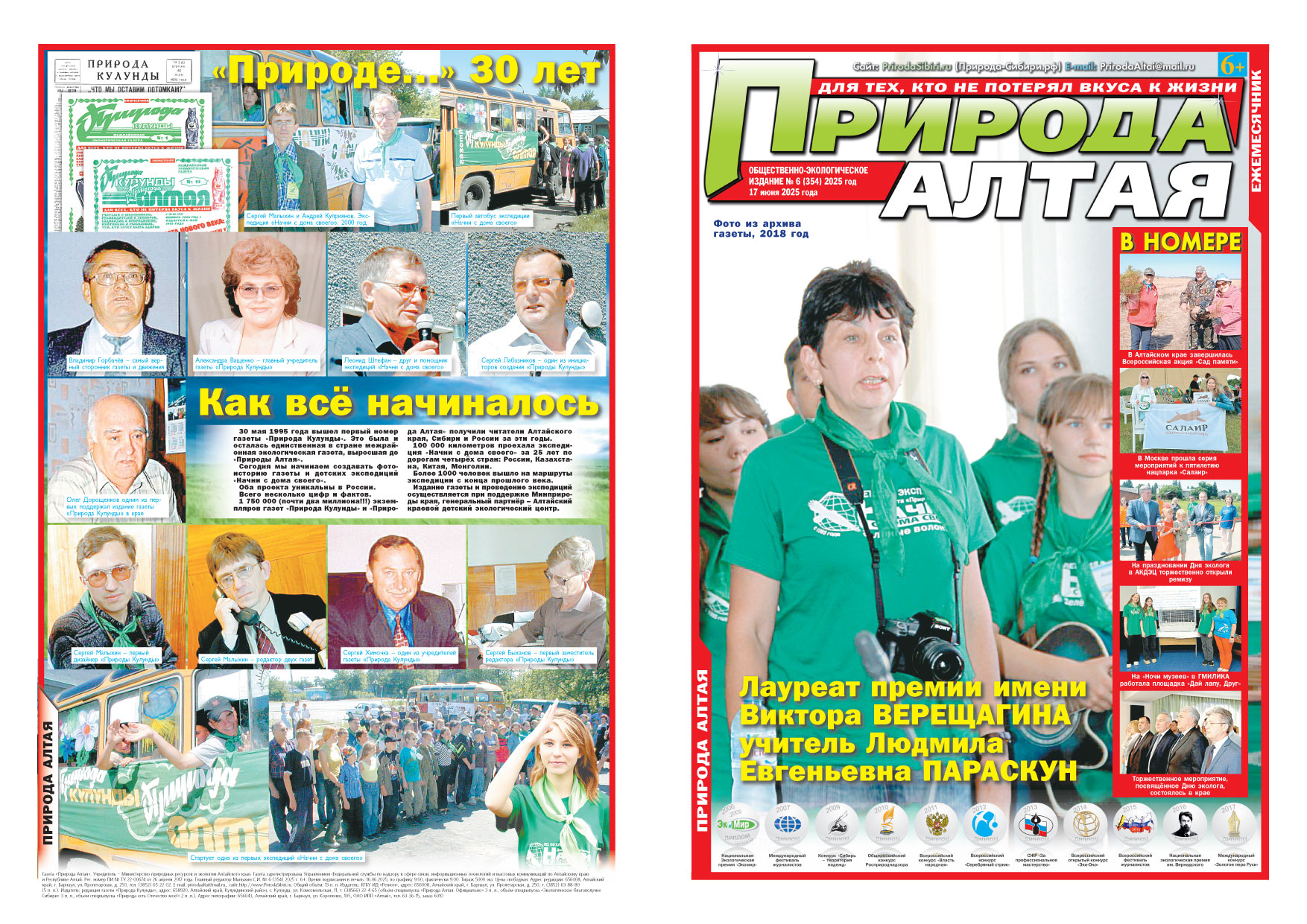 На обложке июньского номера «Природы Алтая» лауреат этого года Людмила Параскун в зеленом галстуке и зеленой футболке потому, что в 2018 году участвовала в нашей экспедиции «Начни с дома своего».