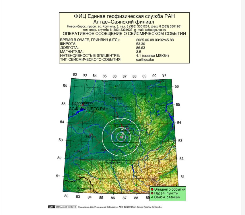 В Алтайском крае зафиксировали землетрясение магнитудой 3,5