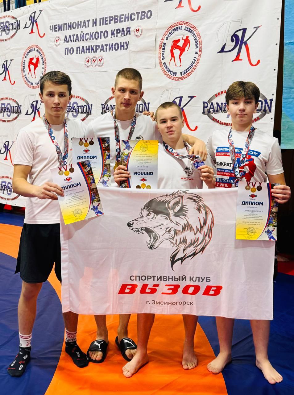 В воскресенье завершились соревнования по спортивной борьбе панкратион на Первенстве Алтайского края. Все четверо участников первенства края по панкратиону из Змеиногорского клуба «Вызов» (ДТДиМ Змеиногорского района) добыли в упорных боях путевку на чемпионат и первенство Сибирского федерального округа. Поздравляем с успешным выступлением тренера Сергея Крохалева!