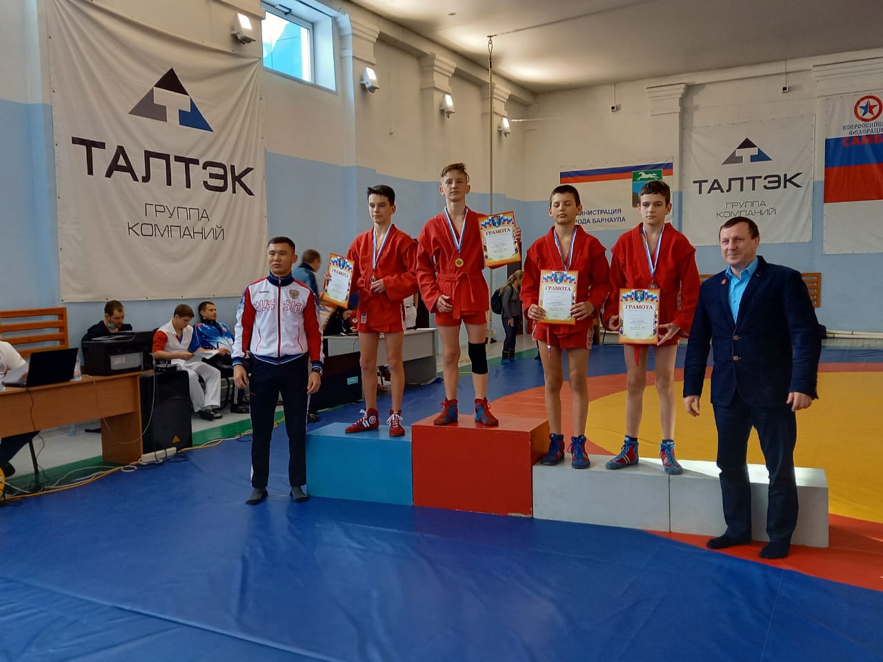 С 4 по 6 марта в Барнауле прошло первенство Алтайского края по самбо, среди юношей и девушек 2007-2008 г.р.Турнир был довольно представительным и конкурентным. Участвовало 27 команд и 252 спортсмена. По итогам всех дней соревнований двое наших борцов завоевали призовые места: золото - Степан Тулубаев и бронза у Дмитрия Рощепкина. Тренирует ребят - Сергей Ломиворотов. С такими результатами наши борцы прошли отбор на первенство Сибирского Федерального округа по самбо, которое пройдет с 7 по 9 мая в Томске. Пожелаем удачи нашим спортсменам и дальнейших побед на соревнованиях столь высокого уровня!