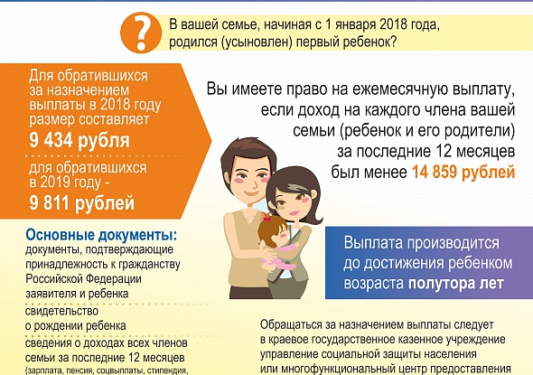 Ежемесячная выплата в связи рождением (усыновлением) первого ребенка предоставляется в соответствии с Федеральным законом от 28.12.2017 № 418-ФЗ «О ежемесячных выплатах семьям, имеющим детей». Выплата осуществляется до достижения ребенком возраста 1,5 лет, за счет средств федерального бюджета.