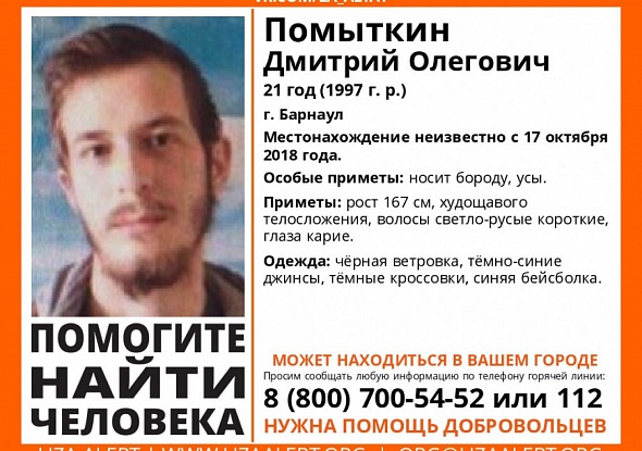 В Алтайском крае в октябре 2018 года пропал 21-летний Дмитрий Помыткин. Молодого человека до сих пор ищут, пишут в группе «Лиза Алерт».