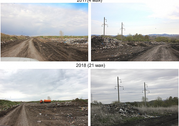 Вы видите на фотоколлаже четыре снимка. Два сделаны в прошлом году по дороге на свалку, два - в нынешнем. Мы хотели сравнить их и найти перемены к лучшему.
