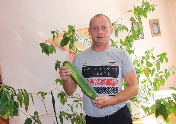 Вот такой большой огурец вырастил на своем огороде змеиногорец Евгений Петров.