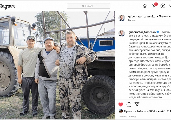 Губернатор Алтайского края Виктор Петрович Томенко разместил на своей странице в Инстаграме фотографию семьи Савиных из поселка Черепановский Змеиногорского района, недавно спасших от пожара лес и село.
