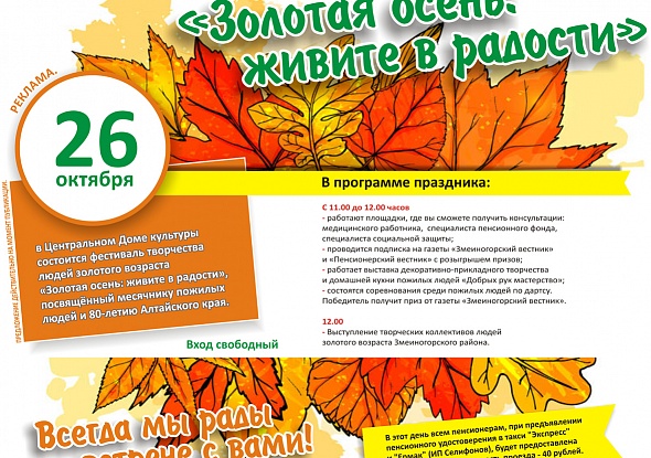 Уже на следующей неделе состоится наш традиционный фестиваль для пожилых "Золотая осень". Ждем всех желающих!