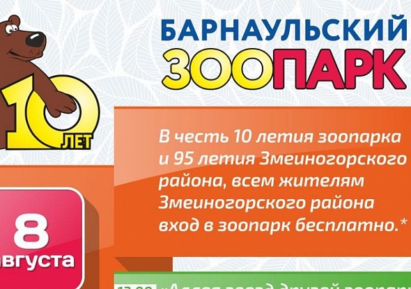 Барнаульский зоопарк, отмечающий в эти дни свой первый 10-ти летний юбилей, поздравляет всех жителей Змеиногорского района с 95-пятилетним юбилеем района! В честь праздника, 8 августа, зоопарк дарит всем жителям района бесплатное посещение.