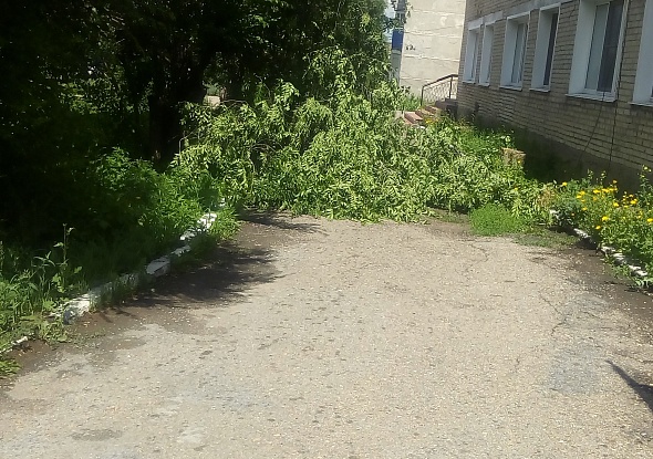 Вечером в субботу, 1 июля, и ночью на 2 июля на Змеиногорский район налетел шторм. Сильный ветер, гроза, дождь гнули и ломали деревья. Несколько микрорайонов Змеиногорска оказались без подачи электроэнергии. На снимке - дерево, упавшее около здания редакции газеты "Змеиногорский вестник и Змеиногорской типографии.