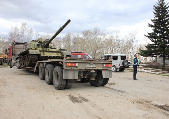Только что на площади в городе Змеиногорске около городского Дома культуры и мемориала Славы приступили к выгрузке танка «Т-62».