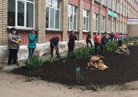 Учителям Змеиногорской школы №1 некогда скучать, даже на карантине в перерывах между уроками дистанционного обучения они приводят в порядок пришкольный участок и прилегающие территории.