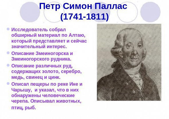 Кстати знаменитый ученый посещал и Змеиногорск. В четверг, 22 сентября, в Алтайском региональном центре Президентской библиотеки (Алтайская краевая универсальная научная библиотека имени Вячеслава Шишкова) состоится презентация межрегионального проекта «Экспедиция Петера Симона Палласа». Проект посвящен исследованиям, которые ученый проводил в Сибири, Поволжье, на Урале и в Крыму.