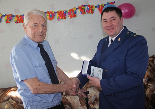 Прокурор Змеиногорской межрайонной прокуратуры В.А. Воробьев вручает В. Я. Зятькову ведомственный знак отличия «За верность закону» II степени.