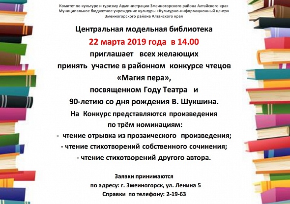 22 марта в Центральной модельной библиотеке пройдет районный конкурс чтецов «Магия пера» посвященного Году театра и 90-летию со дня рождения В.Шукшина.