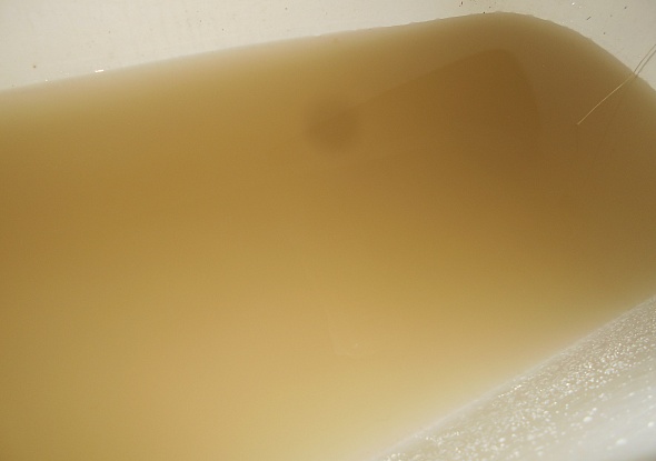 "Здравствуйте. Вот такая "светлая" водичка бежит из крана в "Янтарном". Не то что пить, умываться нельзя..Лицо потом в глине..Пытаемся как-то отстаивать. Соседи привозной пользуются. А в конце месяца будь добр-заплати. И такая ситуация, с переменным успехом, уже несколько месяцев.."