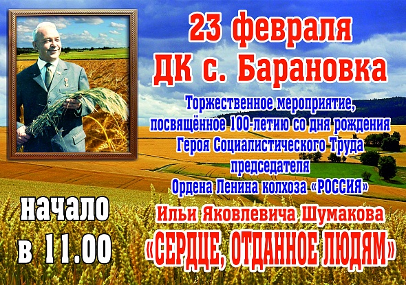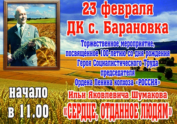 23 февраля в 11-00 в Доме культуры села Барановка состоится праздничное мероприятие, посвященное 100-летию И. Я. Шумакова “Сердце отданное людям”
