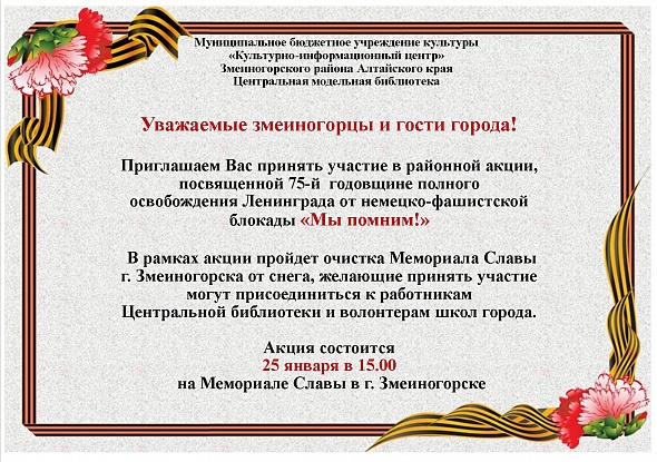 25 января Центральная модельная библиотека и сельские библиотеки районов приглашают своих читателей принять участие в акции по очистке мемориалов участникам Великой Отечественной войны.