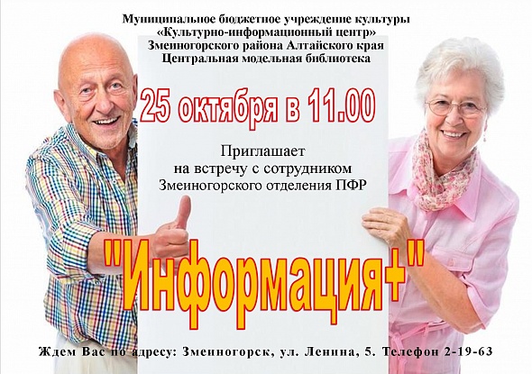 Завтра в 11.00 в МБУК «Культурно-информационный центр» Змеиногорского района Алтайского края Центральная модельная библиотека пройдет встреча с сотрудником Змеиногорского отделения ПФР.