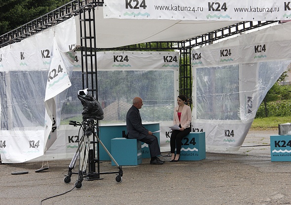 На площади Ленина, около городской администрации работает открытая студия канала Катунь 24.
