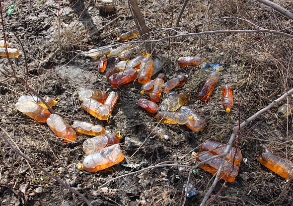 Сегодня жители одного из микрорайонов Змеиногорска, выйдя утром на работу, обнаружили то, что вы сейчас видите на фотографиях: десятки пластиковых бутылок с желто-коричневой жидкостью.