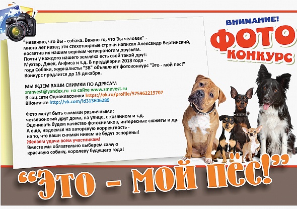 Два дня назад мы объявили фотоконкурс "Это - мой пес!" И сейчас вверху, на главной странице сайта вы можете увидеть первые фото номинантов, будущих хозяев 2018 года! Ждем фотографий ваших четвероногих друзей и любимцев.