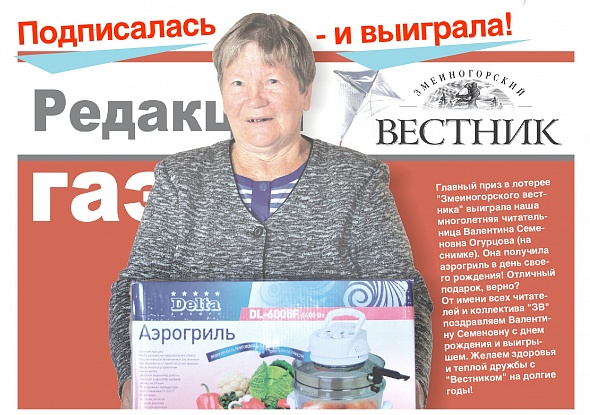 Жительница Змеиногорска, Валентина Семеновна Огурцова, подписав газету «Змеиногорский вестник» во время празднования Дня города стала обладательницей главного приза лотереи. Она выиграла аэрогриль!