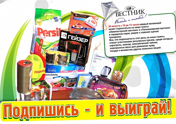 Напоминаем, всем землякам, что 20 августа в парке Змеиногорска, во время празднования Дня города все, кто подпишется на газеты «Змеиногорский вестник» и «Пенсионерский вестник» могут принять участие в розыгрыше призов! Подпишитесь и, уверены, обязательно выиграете!