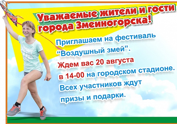 Традиционный фестиваль «Воздушный змей» пройдет в День города 20 августа на стадионе города Змеиногорска ждем детей и подростков для соревнований по запуску воздушных змеев. Берите своего змея и на стадион!